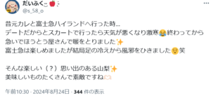 10月あたりに軽装で行って「うわ!!さっっっぶ!!!!」ってなって、無理やり歩き回って体温上げた思い出がある。それでも急流滑りの滝前の橋で待ち構えてびしょ濡れの学生さんとかいたな。笑— えび餡☺︎ ( 🍤 ᷇ᵕ ᷆ )🍤 (@shrimpmoth) September 10, 2025